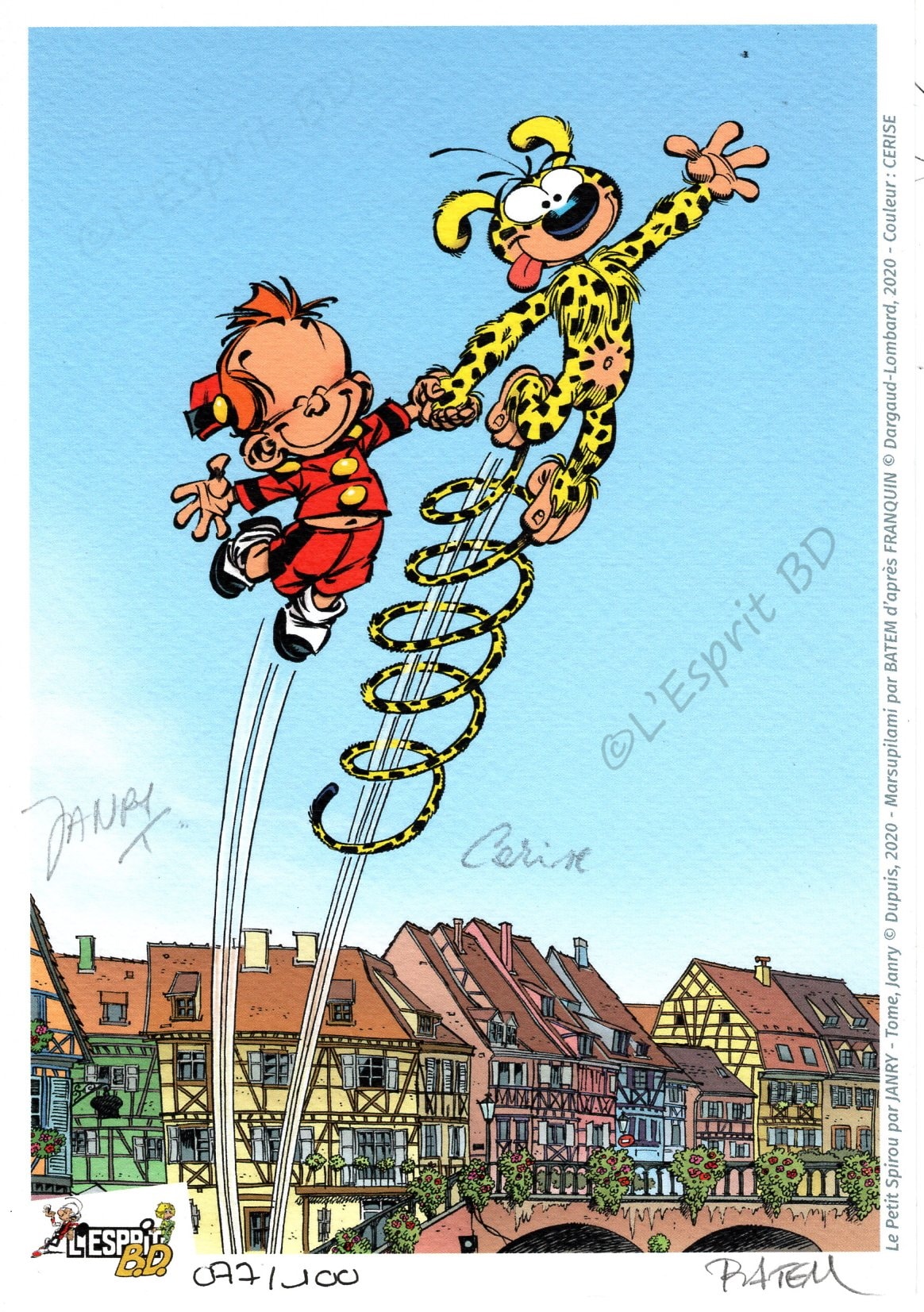 Superbe ex-libris, avec des personnages emblématiques de deux univers qui se rencontrent à Colmar. Signé des dessinateurs et de la coloriste.